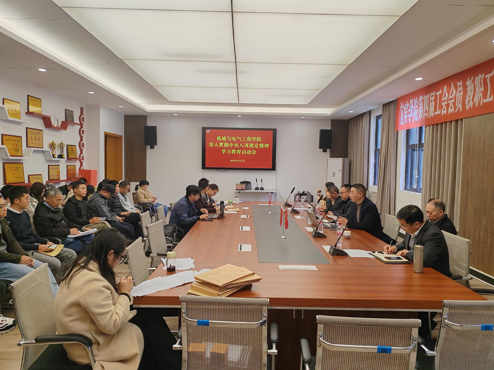 2025年4月2日,机械与电气工程学院召开深入贯彻中央八项规定精神学习教育启动部署会。学院党委书记潘树林主持会议并讲话,全体教职工参加会议。会议深入传达学习了习近平总书记关于加强党的作风建设的重要论述精神,认真研读了中共中央办公厅印发的《关于在全党开展深入贯彻中央八项规定精神学习教育的通知》及上级党委相关会议和文件精神,并对学院的具体落实方案与学习活动安排进行了详细部署。