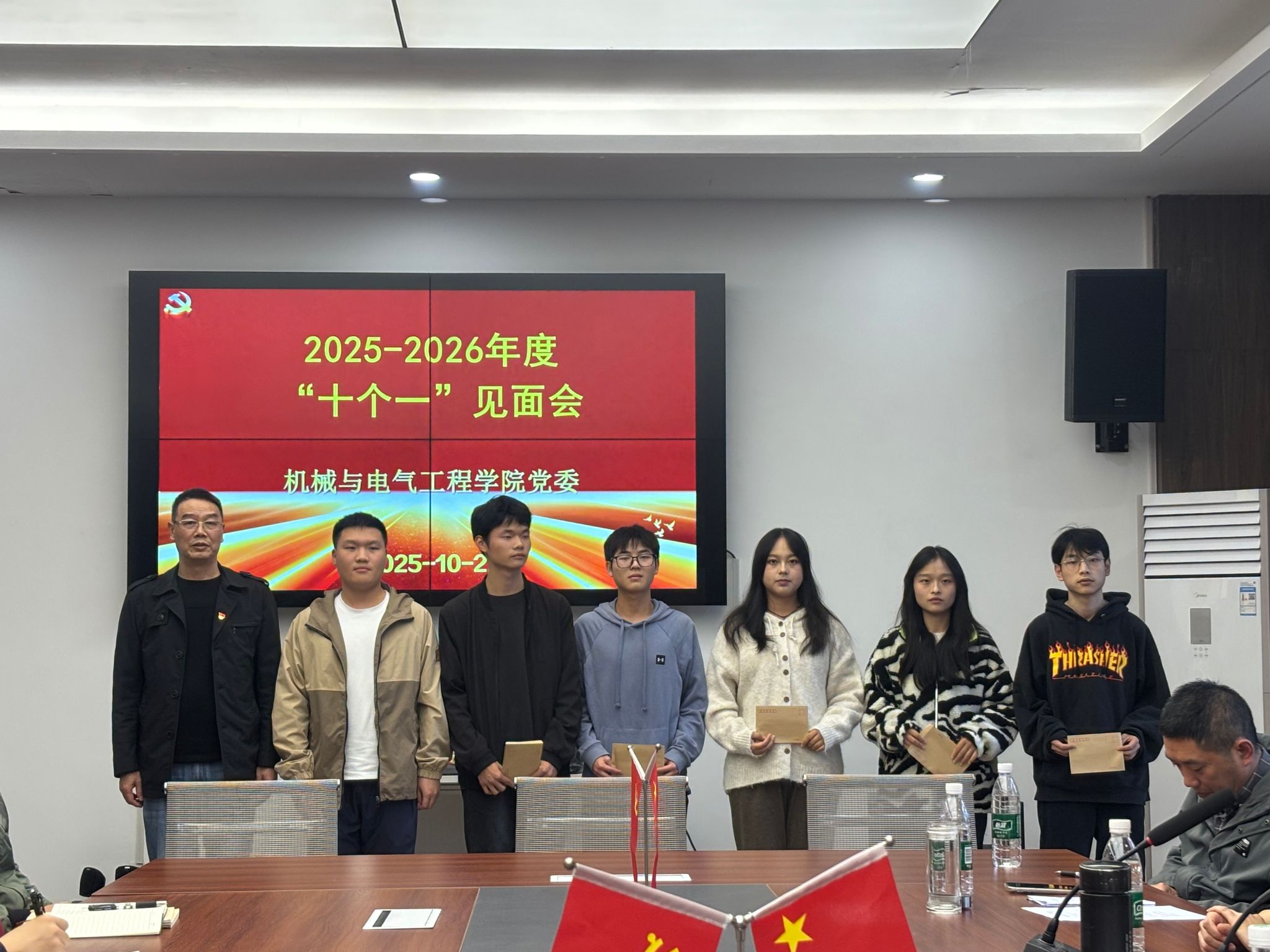 机电学院党委副书记顾秋香宣读《机械与电气工程学院2025-2026学年“十个一”活动联系名单》。随后,机电学院党委书记潘树林和正处级组织员许泽宏为受资助的十八名家庭经济困难学生发放资助金。机电学院2022级3班郭丽红同学代表全体受资助学生对党组织给予的关心和帮助表示感谢。会后,党员干部和党员教师分别与所联系的学生进行了深入交流,全面了解每位学生的基本情况,致力于为学生提供实际的帮助和支持。