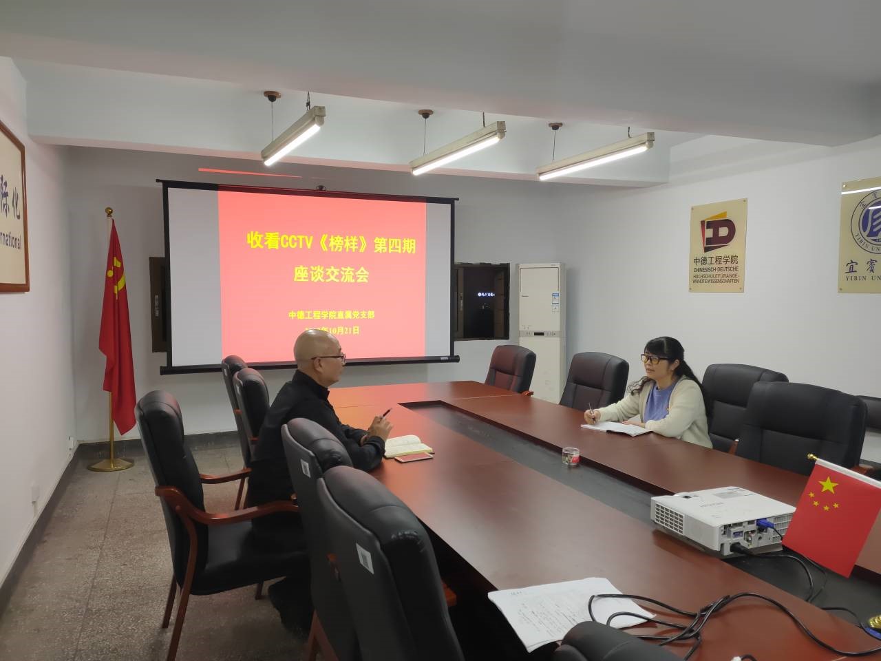 观看学习完后,中德工程学院直属党支部组织处级干部召开观看《榜样4》座谈交流会。党支部书记田蜀华,中美应用技术学院副院长刘建华参会。