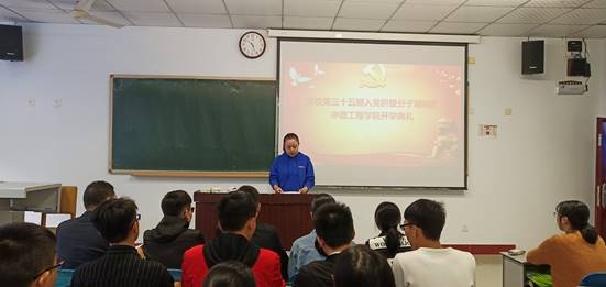 首先,蒋易强博士介绍了本次典礼的流程,以及参加入党积极分子培训班的重要意义,希望同学们能成为守纪、守规的好分子;能以成为入党积极分子为荣;能因之更加努力奋斗,成为集体的标杆。