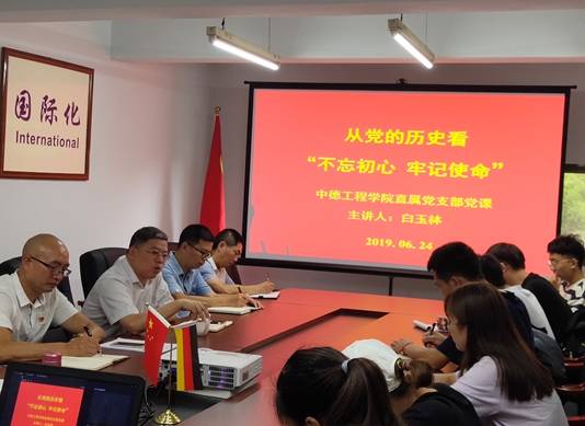 白玉林同志从中国共产党成立的最低纲领和最高纲领分析了“不忘初心、牢记使命”的历史逻辑;通过对毛泽东同志《为人民服务》、《纪念白求恩》、《愚公移山》的学习体会,分享了经典著作蕴含的思想源泉和精神力量;他希望中德工程学院的全体中共党员和积极要求进步的青年同学要深入了解中国共产党的历史,要重温历史和初心。