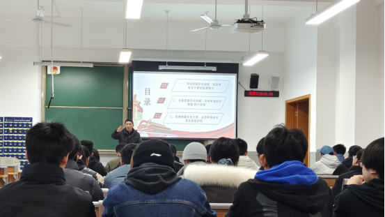 蒋易强从三个部分来展开:一是深刻把握历史进程,从百年党史中感悟思想伟力,二是全面把握历史贡献,从百年党史中增强自信,三是准确把握历史大势,从百年党史中笃定前进步伐,带领同学们了解党的伟大历程,增强道路自信,传承红色基因,发扬党的优良传统,把党史学习与专业学习结合起来,从党史学习中把握好历史发展规律,坚定政治方向。