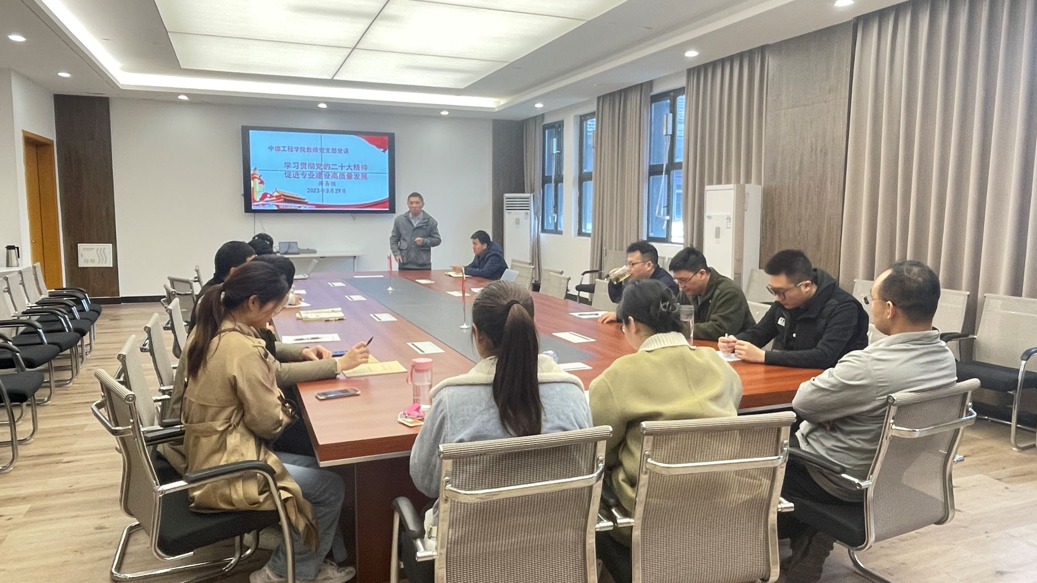 2023年3月29日,中德工程学院教师党支部在临港校区3412会议室召开专题党课,学习贯彻党的二十大精神,促进专业建设高质量发展。党支部书记蒋易强给支部全体党员讲党课。中德工程学院教师党支部17名党员同志参会学习。