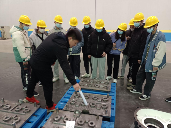 在集中学习阶段,厂党政办李小红主任向老师和同学们介绍了德恩精工公司的背景、产业规模、产品类型以及公司待遇等总体情况;分公司总工程师卢运富讲解了产品关键工艺流程及关键工序技术。在分组实训和实操阶段,同学们依次进行熔炼工序、垂直造型工序、垂直浇注工序、水平造型工序、水平浇注工序、理化检测、数控车床加工、龙门五面加工中心、仓储物流等多项实训和实操。在最后的培训感悟及交流阶段,李小红主任、卢运富总工程师对同学们提出的问题进行解答。