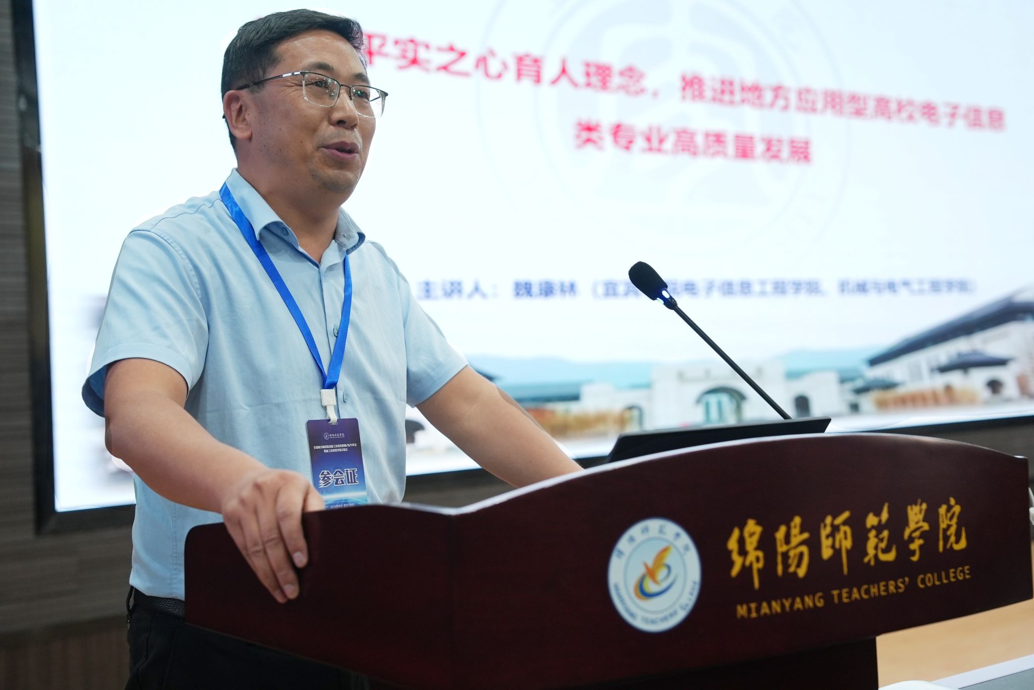 在会议第三环节新工科建设经验交流会,绵阳师范学院、浙江师范大学等14所地方师范院校结合学校实际就新工科的建设做了汇报交流,其中魏康林代表宜宾学院新工科建设,作了题为 “践行平实之心育人理念,推进地方应用型高校电子信息类专业高质量发展”的专题报告,分别从办学定位、专业建设举措、培养成效、特色发展四个方面就学院的新工科专业发展、人才培养方面做了汇报交流,展示了宜宾学院“做强工科、转型发展”的思路、方法与举措。