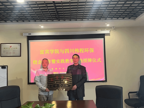此外,环境工程专业教研室主任曾韵敏就伟程环保对毕业实习生的培养和关心表示了衷心的感谢。最后,双方举行了宜宾学院与四川伟程环保公司实践教学基地授牌仪式。