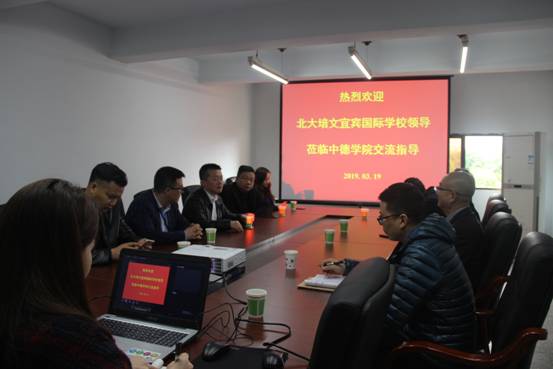 2019年3月19日,北大培文宜宾国际学校校长王全中一行来到中德工程学院,洽谈合作办学事宜。中德工程学院直属党支部书记田蜀华以及相关老师等出席了会议。