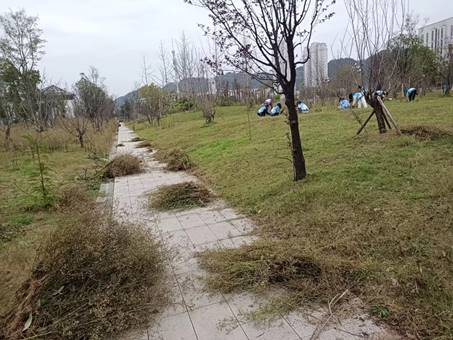 2022年11月13日下午14:50,国应青队在宜宾学院临港校区三号楼前集合清点完人数后,在青队队长的带领下志愿者们来到校园里的花园。在队长传授完除草技巧和注意事项后,大家戴上手套,从道路两旁开始除草、稀释营养液、浇灌树木、清理现场。在大家的一致努力下,花园里的大多数杂草都被清理干净,花园变的更加整洁有序,环境卫生得到了明显改善。