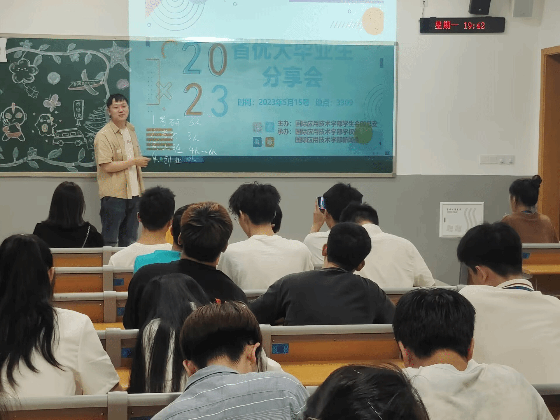 为发挥优秀毕业生的榜样引领作用,更好地激发学部学子积极进取的精神,提高自身的综合素质,国际应用技术学部于5月15日晚上七点半在3309教室召开了2023届省优大毕业生分享会。此次会议邀请到了19级二班建筑电气与智能化的刘香、19级一班汽车服务工程的朱永潘和19级四班的工程管理的杨连杰3位分享嘉宾,为在校学生和毕业生之间创造了一个良好的沟通交流平台。