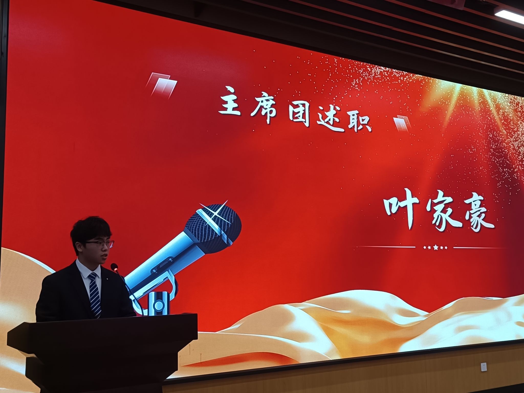 团总支副书记叶家豪作为主席团代表进行述职,他表示一年来,团总支学生会各部门在思想引领、组织建设、科技创新、社会实践、志愿服务、学生社团和校园文化活动等领域广泛开展工作,积极为青年同学们做好事做实事,发挥好桥梁和纽带作用,认真落实“全心全意为同学服务”的宗旨,不忘初心、砥砺前行。