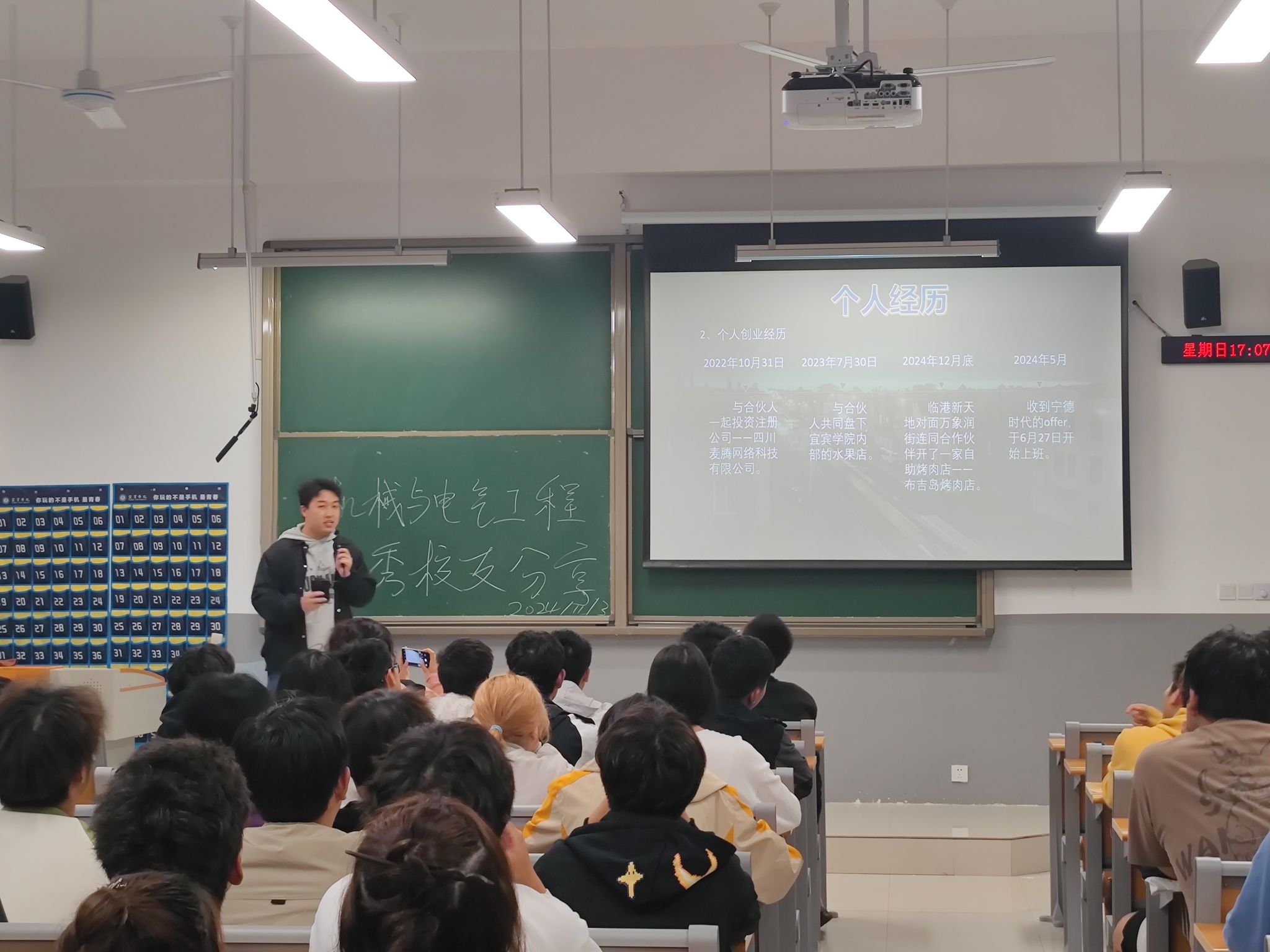 随后,大会进入主题分享环节。几位特邀嘉宾校友围绕个人成长经历、职业发展道路以及面对挑战时的态度与方法进行了精彩演讲。其中,校友曾虹辉作为四川麦腾网络科技有限公司的创始人之一,分享了他的创业经历和对未来的展望;而宜宾创能公司员工何鸿则从企业招聘的角度出发,探讨了公司所需人才的品质和能力要求,激励学弟学妹提前为就业工作做准备;宋煦圣分享了自己考研的历程,包括重要时间点需注意的事项,鼓励学弟学妹坚持下去,朝着心中的梦想高校奋力一搏。校友赖益宁和吴疆涵也随后分享了自己在工作后的心得和收获。这些真实的案例和深刻的见解不仅让在场的师生受益匪浅,也激发了大家对未来无限可能的憧憬。