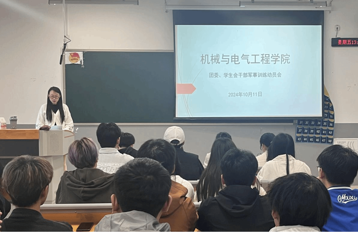 为了贯彻习近平总书记关于青年成长和国防教育的重要指示精神,进一步增强学院团委、学生会干部的纪律性、团队协作力和责任感,并充分发挥学生干部的引领作用和退役士兵的榜样力量,机械与电气工程学院于2024年10月11日下午13:00在杏林三栋3312开展了团委、学生会干部军事训练动员会。机械与电气工程学院党委副书记顾秋香、学工办副主任张袁媛、学工办专职辅导员、机械与电气工程学院退役大学生士兵校园服务队全体队员以及学院团委、学生会全体学生干部参加了此次动员会。