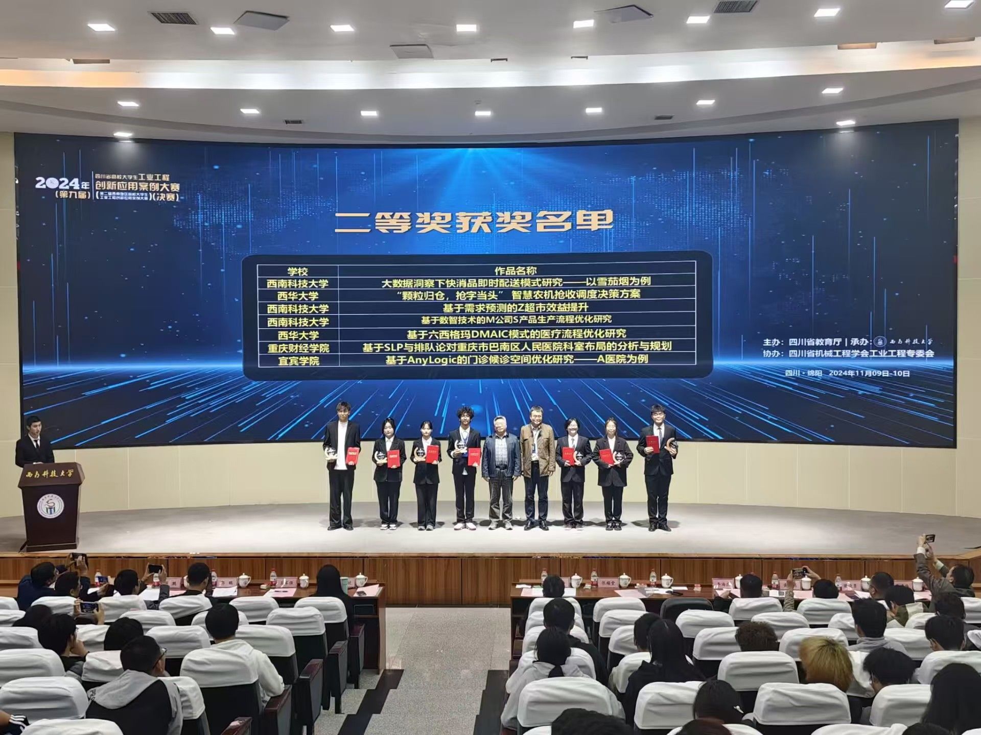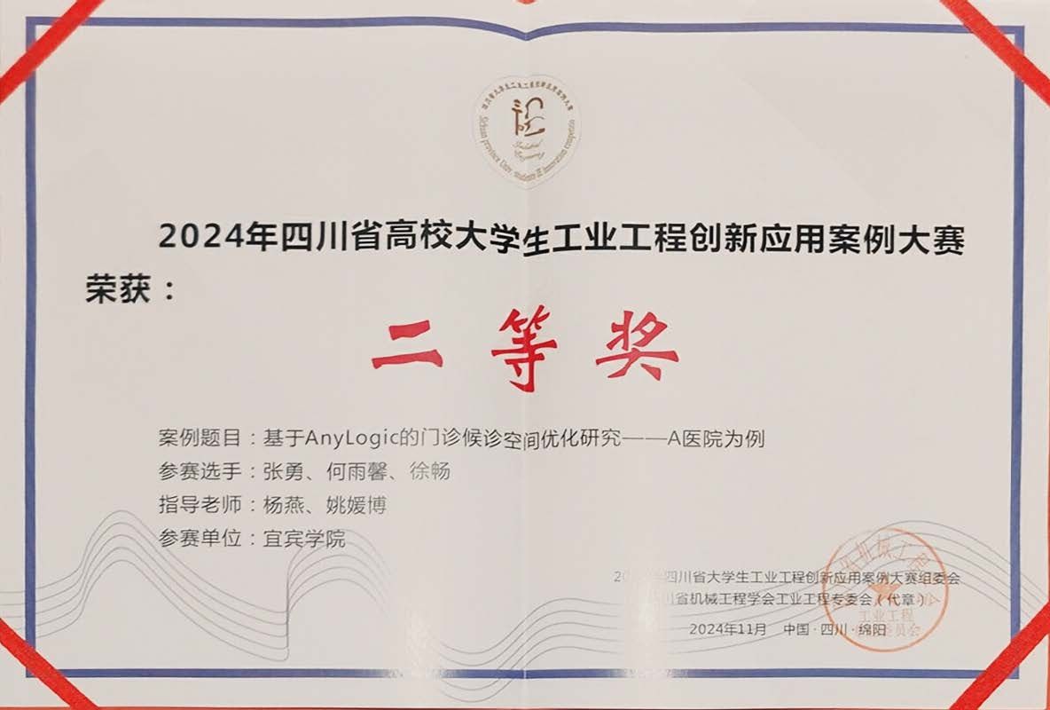 2024年11月9日,第九届四川省高校大学生工业工程创新应用案例大赛(西南地区高校大学生工业工程创新应用案例大赛)在西南科技大学举行,宜宾学院案例项目“基于AnyLogic的门诊候诊空间优化研究”荣获二等奖。