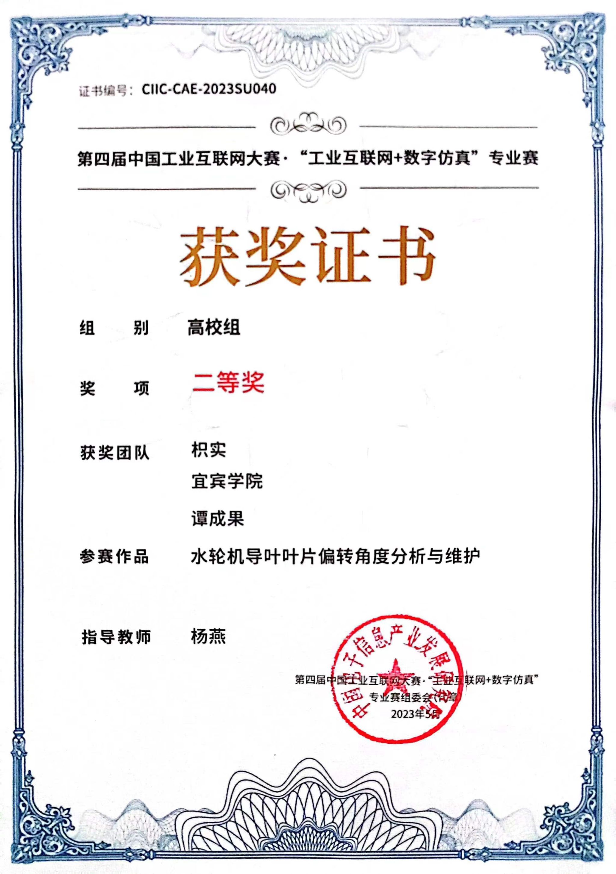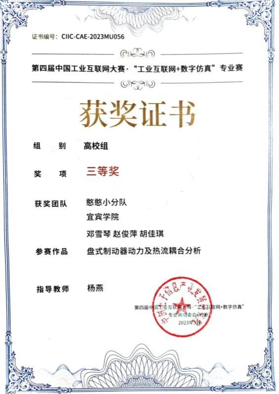 据悉,此次大赛于2022年11月正式启动以来,共吸引了来自全国包括吉林大学、北京工业大学、中国石油大学(北京)、中国民航大学、成都理工大学等知名高校在内的近百所高校及企业共270支队伍报名参赛。经过初赛提交作品、专家线下审查、决赛路演和现场答辩,由我部杨燕博士指导,学生谭成果独立完成的作品“水轮机导叶叶片偏转角度分析与维护”获得高校组二等奖,邓雪琴、赵俊萍和胡佳琪3名学生协作完成的作品“盘式制动器动力及热流耦合分析”获得高校组三等奖。在此次备赛过程中,国际应用技术学部共200余名参加到国产自主仿真软件培训工作,其中21名同学成功考取了工业和信息化部颁发的《仿真(CAE)应用工程师》证书。