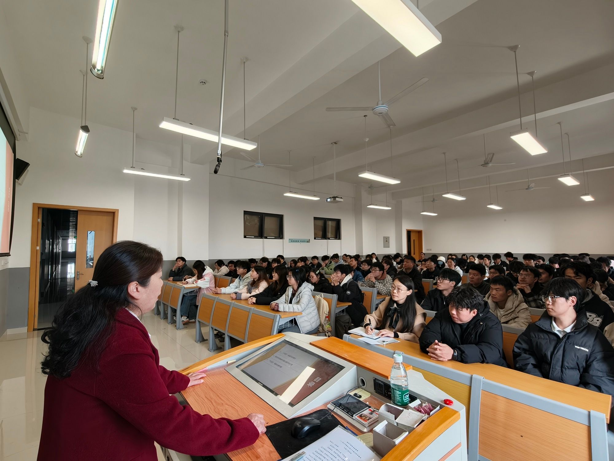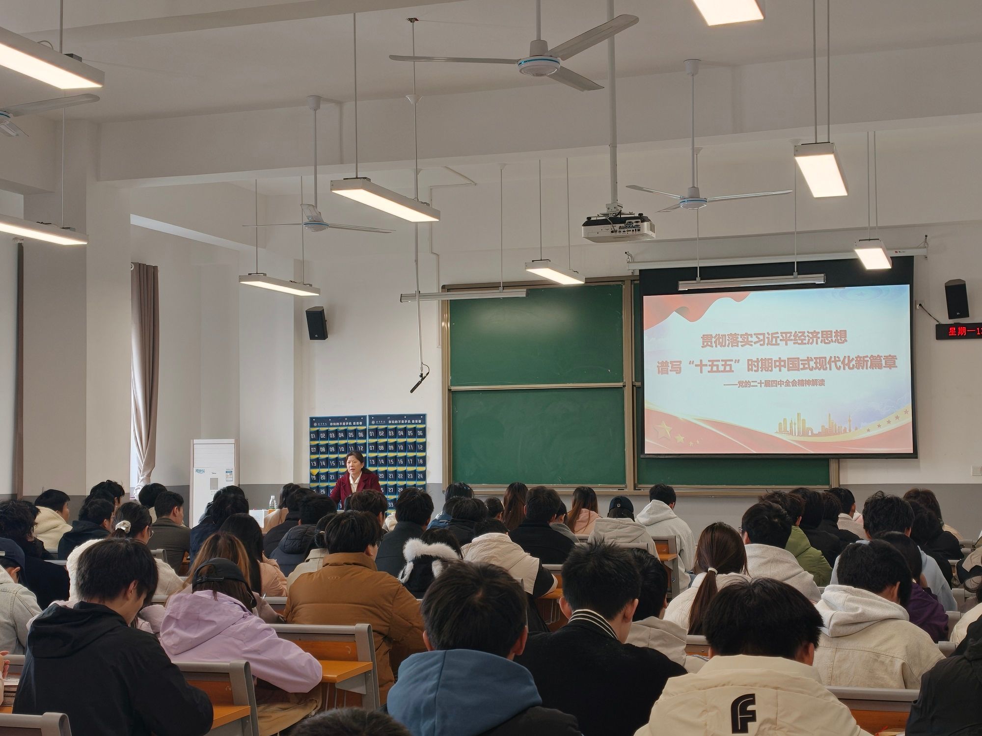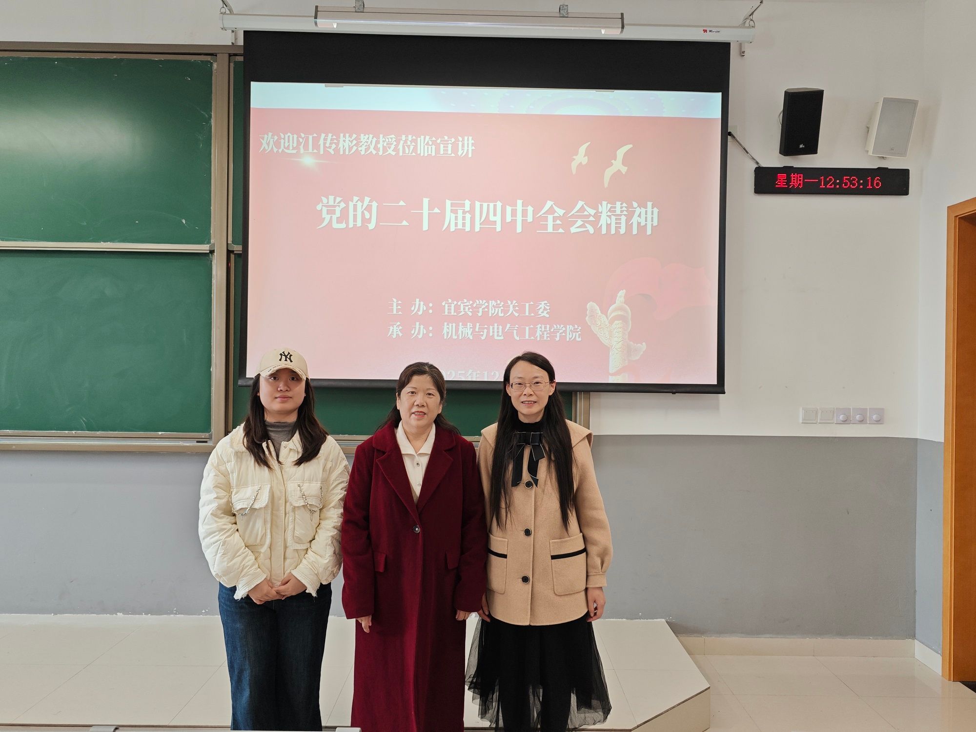 为进一步引导青年学子深刻领会党的二十届四中全会精神的丰富内涵与核心要义,2025年12月1日中午,由宜宾学院关心下一代工作委员会(以下简称学校关工委)主办、机械与电气工程学院(以下简称机电学院)承办的党的专题宣讲会在机电学院3310教室举行。宣讲会由机电学院党委副书记顾秋香主持。校关工委江传彬教授作题为“贯彻落实习近平经济思想谱写‘十五五’时期中国式现代化新篇章”的专题辅导报告,机电学院百余名学生党员、发展对象、入党积极分子和青马班学员参加。