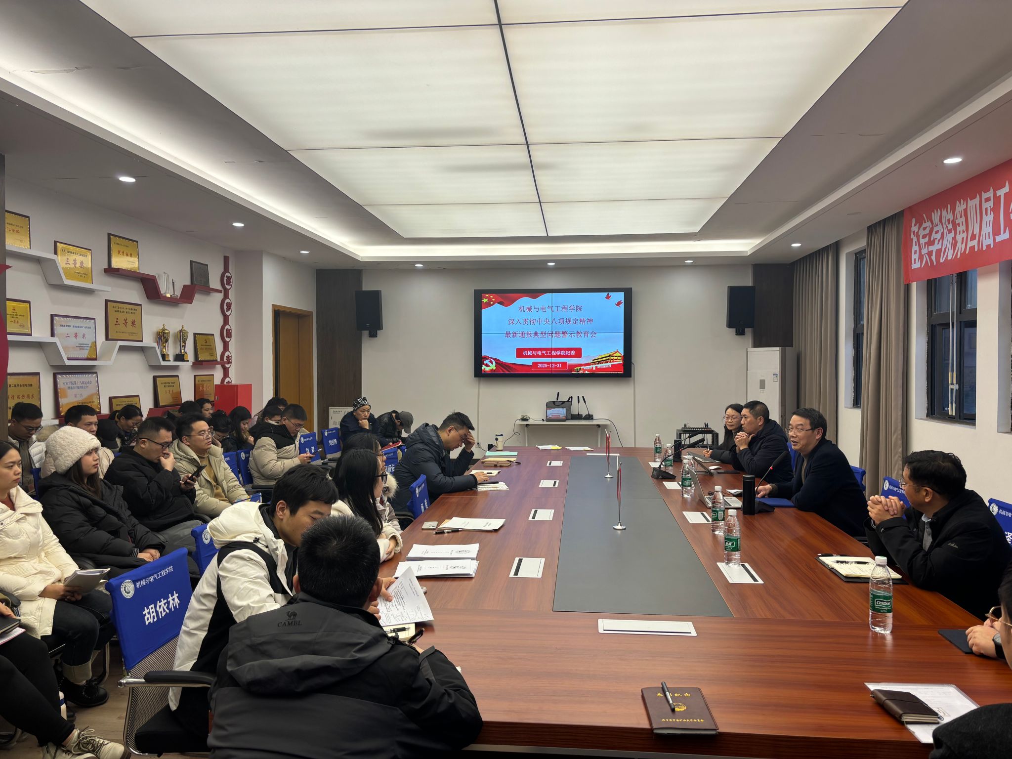 2025年12月31日,宜宾学院机械与电气工程学院召开专题学习会,组织学院党员领导干部和教职工集中学习中央纪委国家监委、四川省纪委监委近期公开通报的违反中央八项规定精神典型问题案例。学院纪委书记顾秋香主持会议。