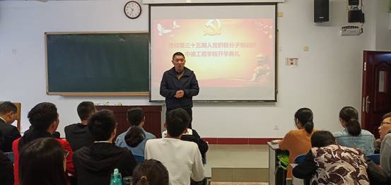 首先,蒋易强博士介绍了本次典礼的流程,以及参加入党积极分子培训班的重要意义,希望同学们能成为守纪、守规的好分子;能以成为入党积极分子为荣;能因之更加努力奋斗,成为集体的标杆。