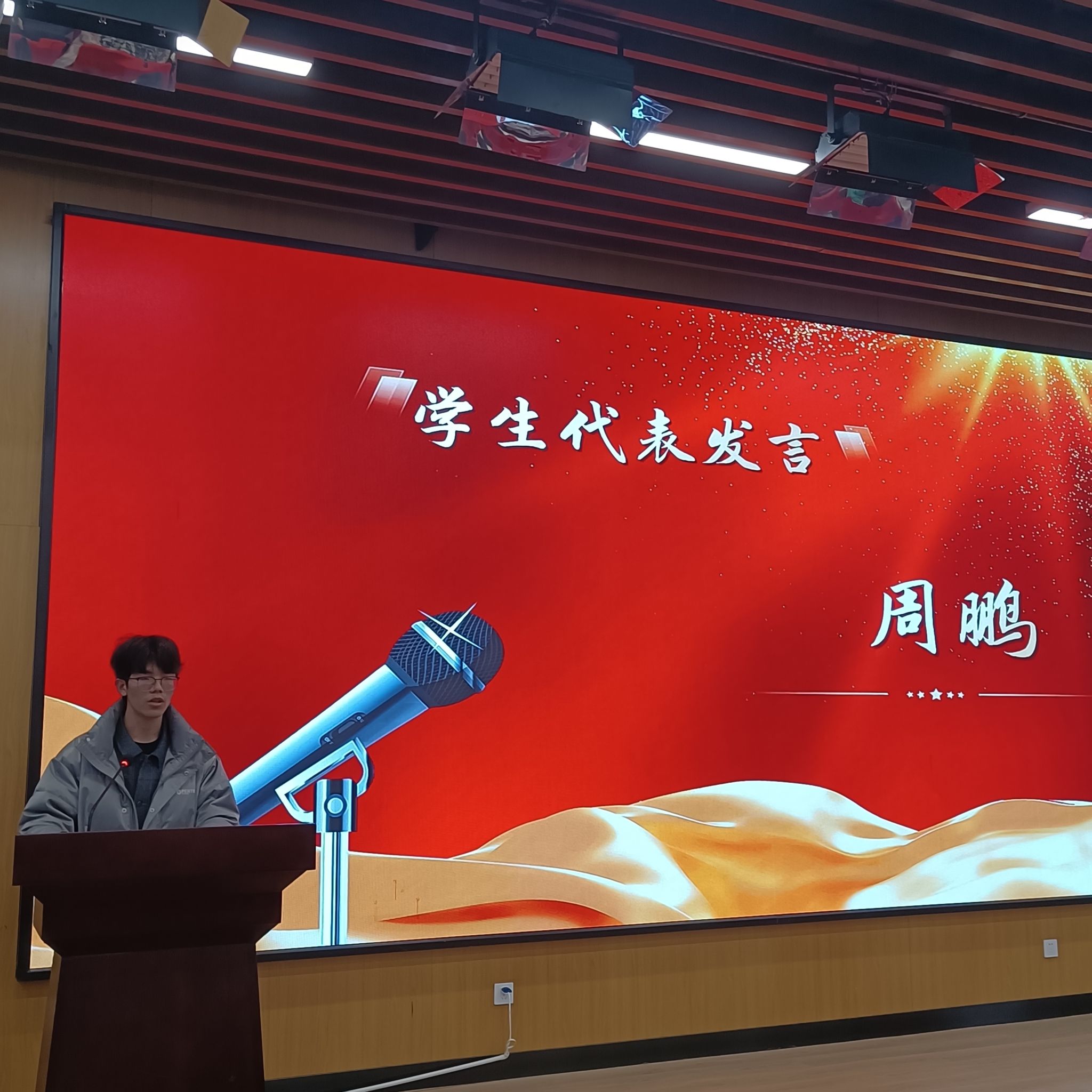 2021级学生周鹏代表学生做了发言,他首先感谢学校和学部多年来对同学们的培养。他表示,作为青年学生,自己将继续潜心钻研、不断突破,立志成为具有崇高理想信念、深厚文化底蕴、扎实专业知识、强烈创新意识和宽广国际视野的国家栋梁和行业精英,为祖国发展贡献青春力量。
