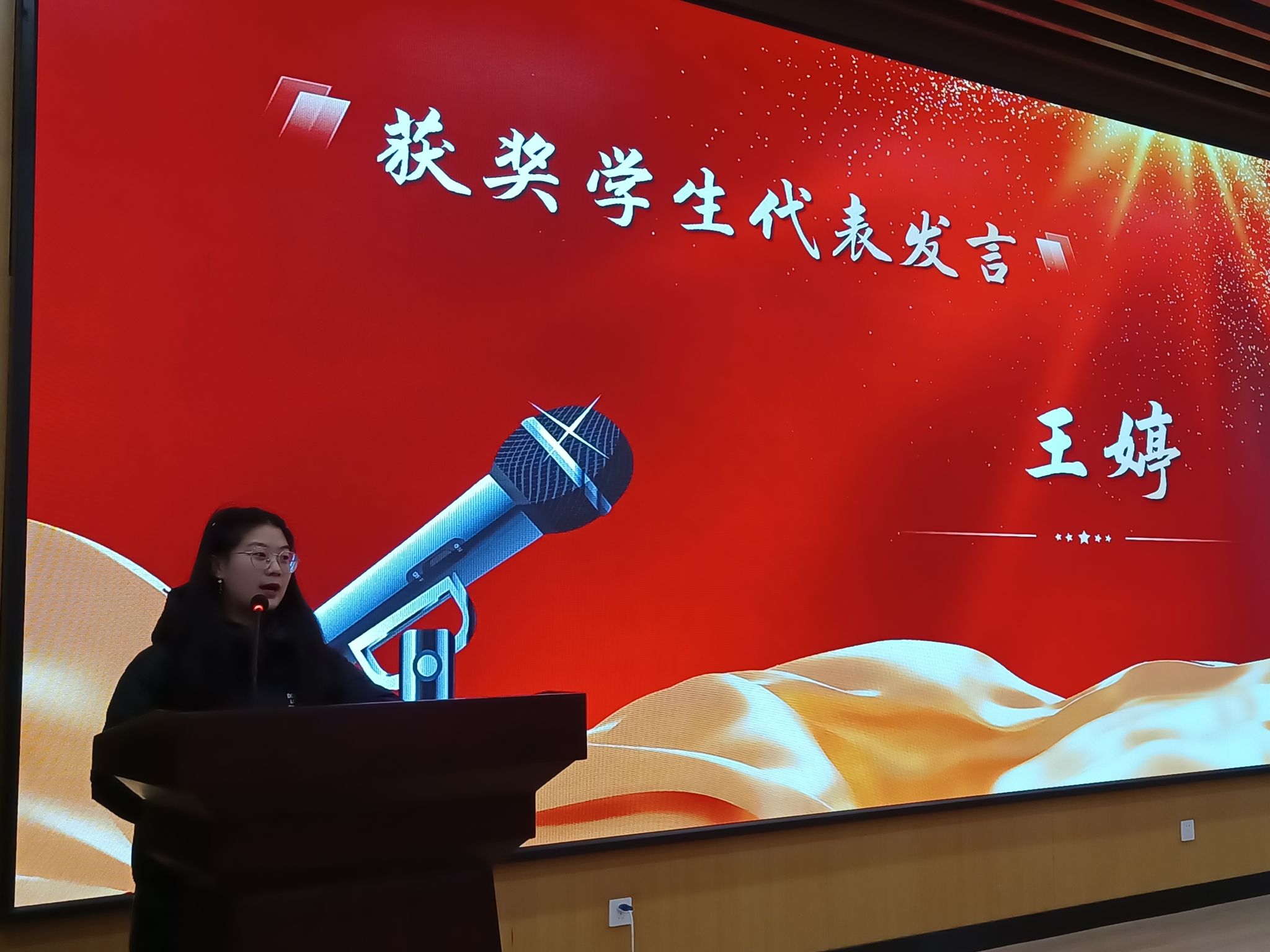 2021级学生王婷代表获奖学生做了发言,她讲述了自己以梦为马、逐光前行、勤学苦练、勇创佳绩的奋斗故事和心路历程,表示将不负青春,不负时代,锐意进取,超越梦想,以更好的表现、更优的成绩、更实际的行动践行习近平总书记对大学生的谆谆嘱托,回报祖国和母校。